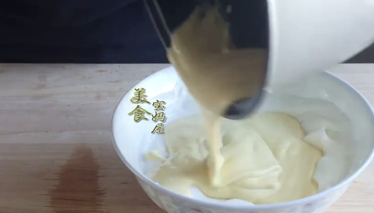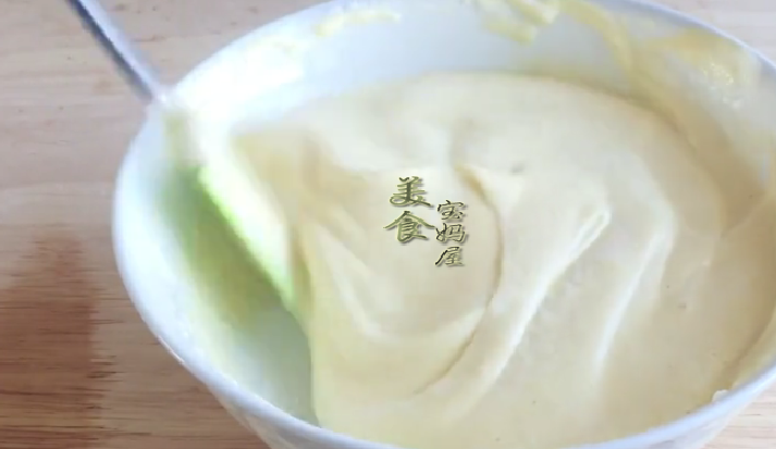 5、把打發好的蛋白,取三分之一加入到打好的小米糊中,用鏟子上下翻拌均勻;然後再把翻拌好的小米糊倒入蛋白霜中,繼續上下翻拌均勻,切記不要順時針劃圈攪拌,以免消泡,翻拌成比較細膩的的面糊就可以瞭。