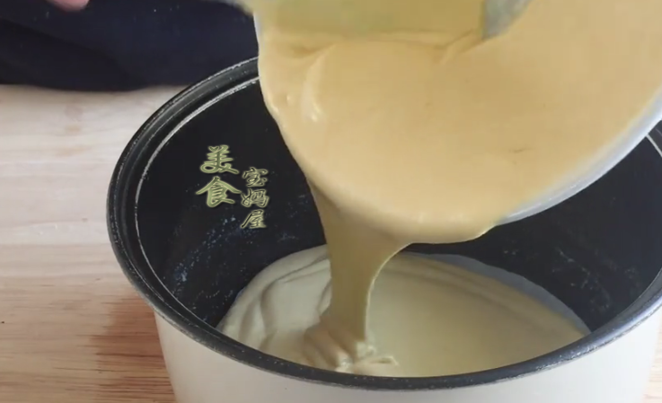 6、在電飯煲內膽壁上抹一點黃油,這樣方便一會蛋糕脫模,傢中沒有黃油的,也可以用食用油代替,然後再在電飯煲底部鋪上一張油紙,防止粘鍋,當然也可以不鋪,自己刷層食用油即可,然後把翻拌好的米糊倒入電飯煲內膽中,在案板上震動幾下,把裡面的大氣泡排出來。