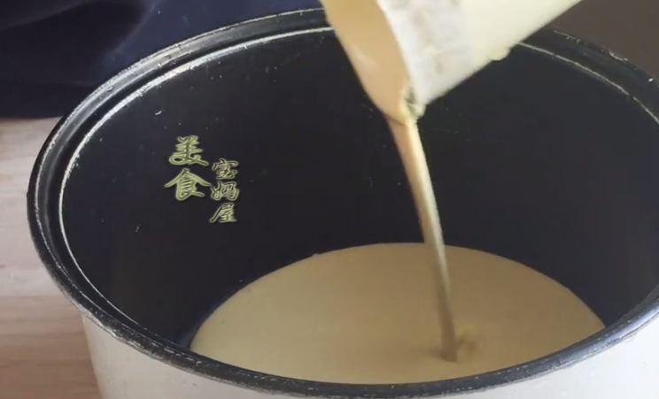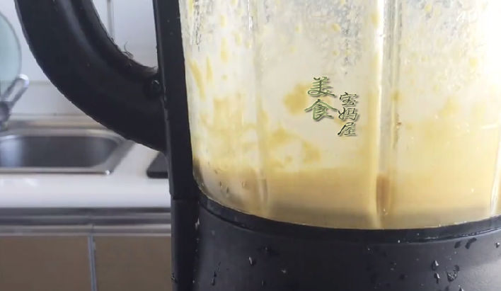 3、把攪拌均勻的小米蛋黃液,倒入料理機中,打成小米糊,打的越細膩做出來的蛋糕口感就會越好;然後把把打好的小米糊,直接倒入電飯煲內膽中,備用。