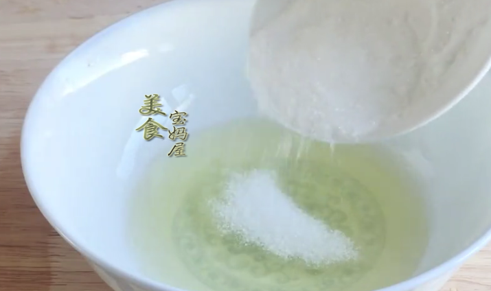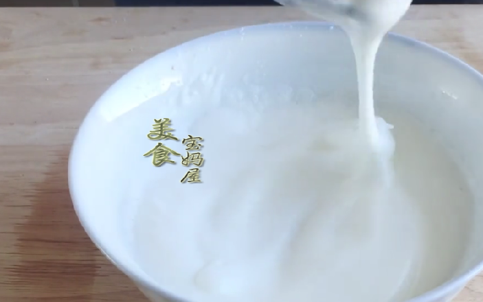 4、打發蛋白:在蛋清中分三次加入30克白砂糖,首先加入白糖的三分之一,然後用電動打蛋器打發蛋白,打發至全部起泡,顏色變白,第二次加入白砂糖,打發至蛋白起紋路後,第三次加入剩下所有的白砂糖,打發至奶油狀,拿起打蛋器掛尖,說明蛋白就打發好瞭。打發蛋白的時候要打適中,打老瞭做出來的蛋糕口感會粗糙,打發不起來,做出來的蛋糕就不起發,容易塌陷。而關於白砂糖的量,也可根據自己的口味自行增減,喜歡吃甜的可以適當多放點,不喜歡吃甜的也可以少放一點,但不可以不加,因為白糖在蛋白的打發過程中至關重要。