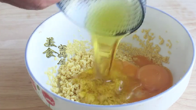 2、在碗中加入150克小米,清洗幹凈後用清水浸泡2個小時。將浸泡好的小米,控幹水分後,加入之前分離出來的2個蛋黃,然後再加入30克的植物油,用勺子把蛋黃打散,攪拌均勻後,再加入幾滴白醋繼續攪拌均勻,加入幾滴白醋的目的是為瞭去除雞蛋的蛋腥味。