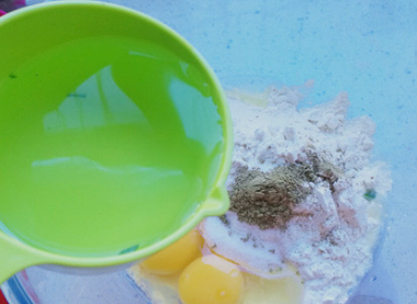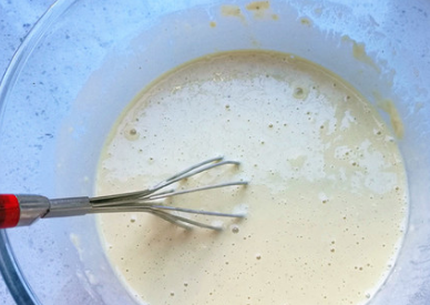 3、在加水的過程中,清水不要一次性放入,看面糊的狀態再加,邊倒邊攪拌,慢慢的添加,到最後面糊有些濃稠,但是還可以順利的流動,那樣的情況是最好的結果