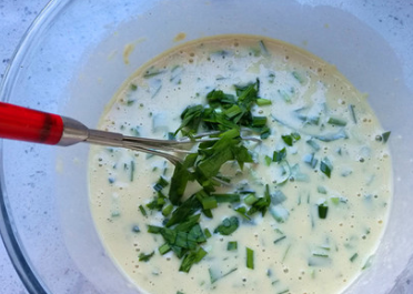 4、隨後把洗幹凈控幹水的韭菜也切碎瞭,並且放到面糊當中,然後把它攪拌均勻