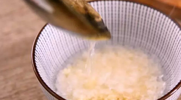 4.碗中加入蒜、白芝麻,再淋上一勺熱油