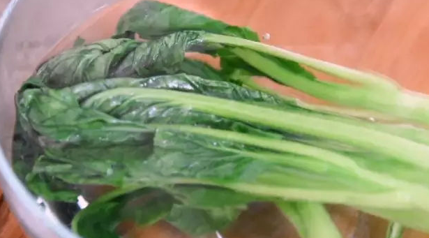 3.再將洗凈的菜心,焯水菜心莖部中心變為透明,撈出過涼水