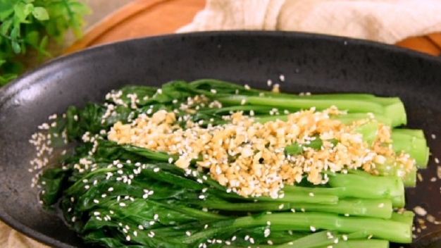 白菜薹180克、蒜20克、生抽10克、精鹽1克、香油10克、芝麻5克、蠔油15克