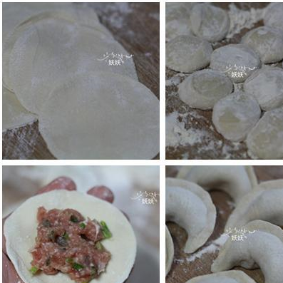 3,往小劑子表面撒適量的幹面粉防粘,用搟面杖搟出餃子皮,包入餃子餡,邊緣捏緊即可。我準備的多,多包一些放在冰箱裡動起來,下次要吃直接煮。