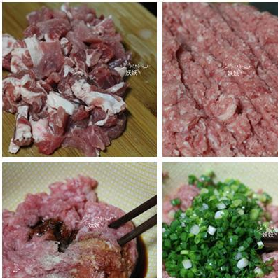 1,將豬肉洗幹凈,用刀剁成肉泥,也可以用攪拌機,幾秒鐘就搞定,剁好的肉餡加入鹽,白胡椒,生抽,老抽,料酒,植物油,用筷子往同一方向攪打上勁,然後加入小蔥碎拌勻備用即可。
