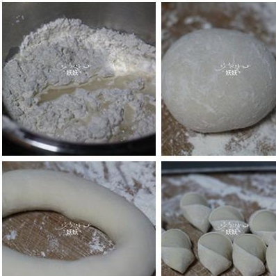 2,60克面粉中加30水,不燙手的溫水為佳,一點一點倒入面粉中,揉成光滑均勻的面團,然後搓成圓環形,用刀切出均勻大小的小劑子。