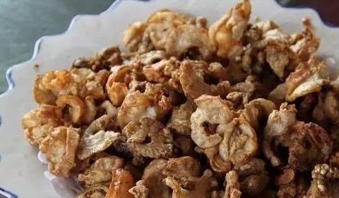 第三個地道的東北下酒菜是很多人有錢也買不到吃不到的食物,因為這個下酒菜是東北的油梭子。其實東北的這種油梭子和我們這邊的豬油渣還是很相似的,隻是他們在制作這樣的油梭子的時候,一般三碗的肥膘才能夠制作出半碗的油梭子,所以這樣的油梭子絕對是濃縮中的精華,而且很多人都是非常的喜歡用這樣的油梭子放在酸菜粉條裡面來吃的,因為這樣的油梭子吃起來真的是越嚼越香,而且還不會特別的油膩。那麼配上白酒來吃的話,他就會特別的下酒瞭。