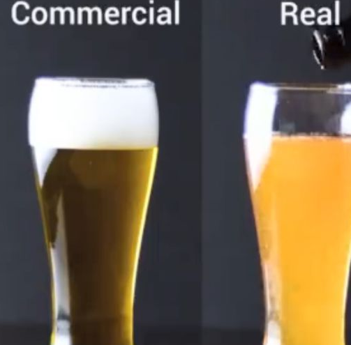 啤酒傾倒而出的綿密泡沫則是來自於杯底先加瞭一層洗潔精或鹽,就為瞭你看廣告時多一份酣暢感。