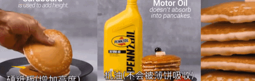 最後淋上去的也並不是蜂蜜,而是流動性更好光澤更明亮還不會被松餅吸收的機油。