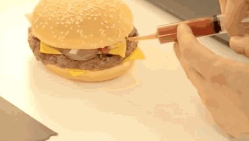 生菜並不需要鋪整片,隻需要用牙簽把他們固定在正對鏡頭的位置;後方墊上一塊化妝棉,讓最頂層的漢堡看起來高一點;番茄醬也隻需要塗在鏡頭拍得到的位置就行瞭;最後再在肉餅上細致地刷上一層植物油,讓肉質看起來更多汁。