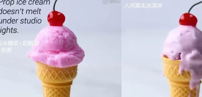 電視裡那些冰淇淋的質感也不是奶油在低溫下呈現的,而是玉米糖漿+起酥油+色素混合而成。