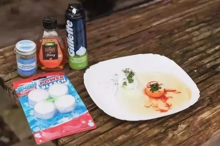 比如這道開胃菜“嫩煎紅蔥頭”其實是嫩煎潔廁寶。