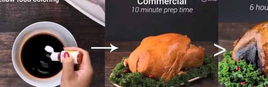 感恩節烤雞這種需要長時間烹飪的菜品攝影師可等不瞭,色素多次著色就能讓生雞達到熟食的品相,而且顏色深淺完全由人工掌控,看起來汁水更為豐沛。
