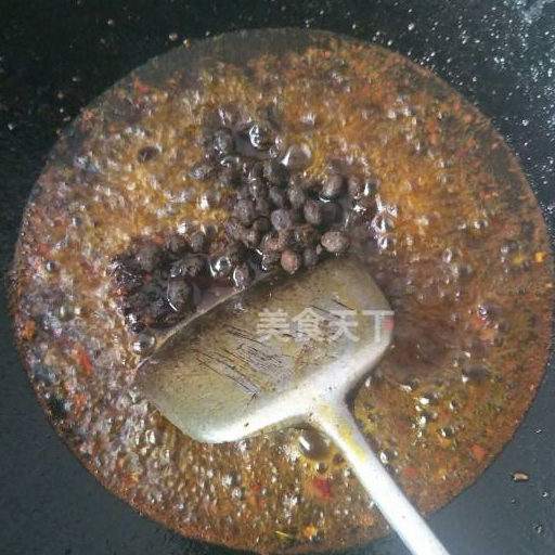 第7步、鍋裡放入菜籽油。放入火鍋底料和豆豉炒出紅油。