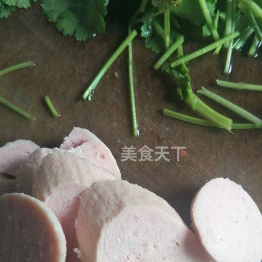 第6步、最後,我們再把火腿腸切片兒,香菜葉切段。所有的食材準備完畢。