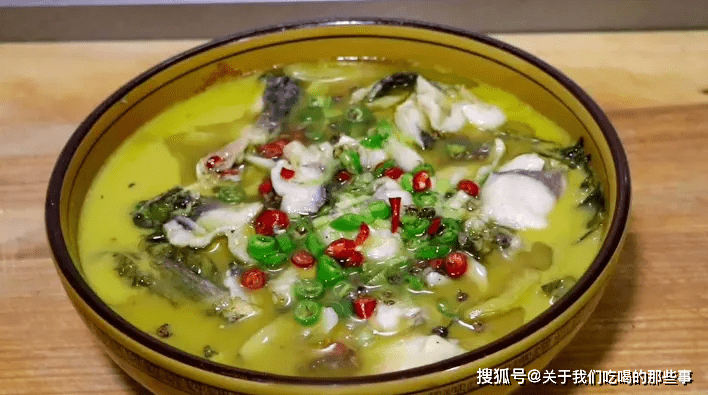 4、把醃好的魚片一片片放入鍋中,大火煮至變色,撈出放在酸菜上,魚湯也倒進來。把蔥花、蒜末、幹辣椒放在上面,潑上熱油熗出香味即可。