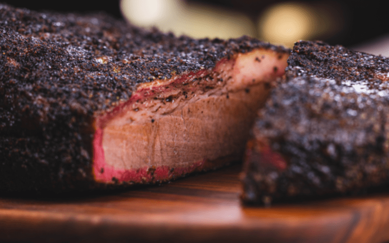 煙熏牛胸肉選用谷飼200天的美國進口牛胸肉,經過12個小時以上的木柴煙熏,牛胸肉外皮充滿果木香氣,軟嫩多汁,肉香濃鬱。沿著表皮,整個牛胸肉的斷面呈現一圈紅色的“煙熏環”,這是隻有用果木煙熏才可以形成的獨有標志。