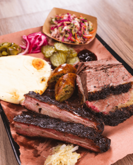 煙熏豬肋排也要經歷整整6個小時的低溫慢烤,才能端上餐桌。經過慢烤的肋排肉質軟爛,可以輕松脫骨,軟骨能輕松嚼碎,十分過癮。特調的酸甜口感醬汁,在熏烤後於肋排表面形成一層深紅色類似釉質觀感的外殼,風味十足。