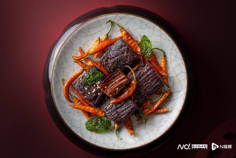 南京長江之舟華邑酒店祝師傅甄選雲南非遺會澤牛幹巴,配上紅河州的那刀黃辣椒和雲南獨有的野生灰芝麻,所呈現的“牛氣沖天”雲椒香酥小黃牛,色鮮味美,口味獨特。