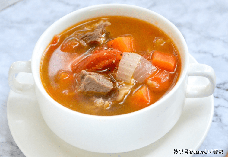 另起鍋加油,燒熱後放入番茄、洋蔥,炒出汁水,再倒入牛肉、胡蘿卜、牛肉湯,繼續燉二十分鐘。