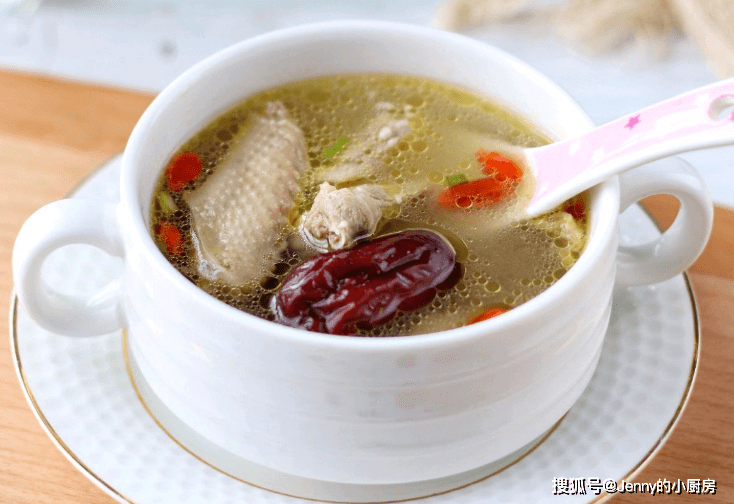 燉好後,加入紅棗,繼續小火煮十分鐘。最後放入枸杞,再加鹽、雞精調味,就可以關火瞭,趕緊喝一碗吧,全身暖和,真舒服。