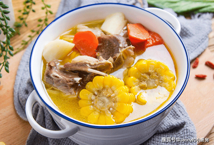 接著倒入足量熱水,煮開後轉小火,燉煮一個小時,再放入山藥塊、胡蘿卜塊、玉米塊,繼續煮半個小時。