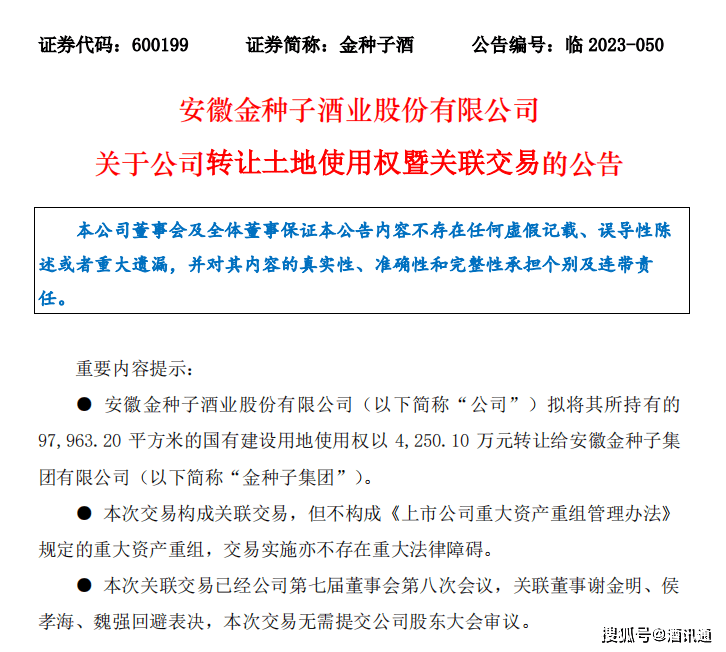 近日,金種子酒(600199.SH)發佈公告稱,擬將其所持有的97963.2平方米的國有建設用地使用權以4250.1萬元轉讓給公司控股股東金種子集團。