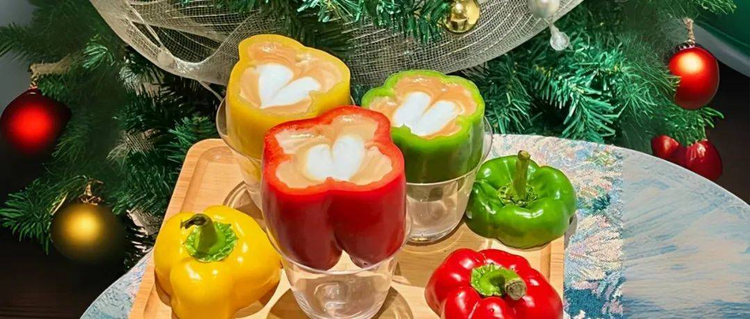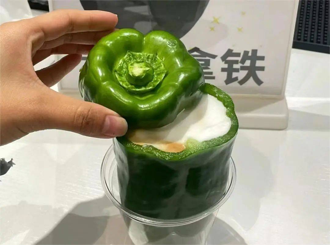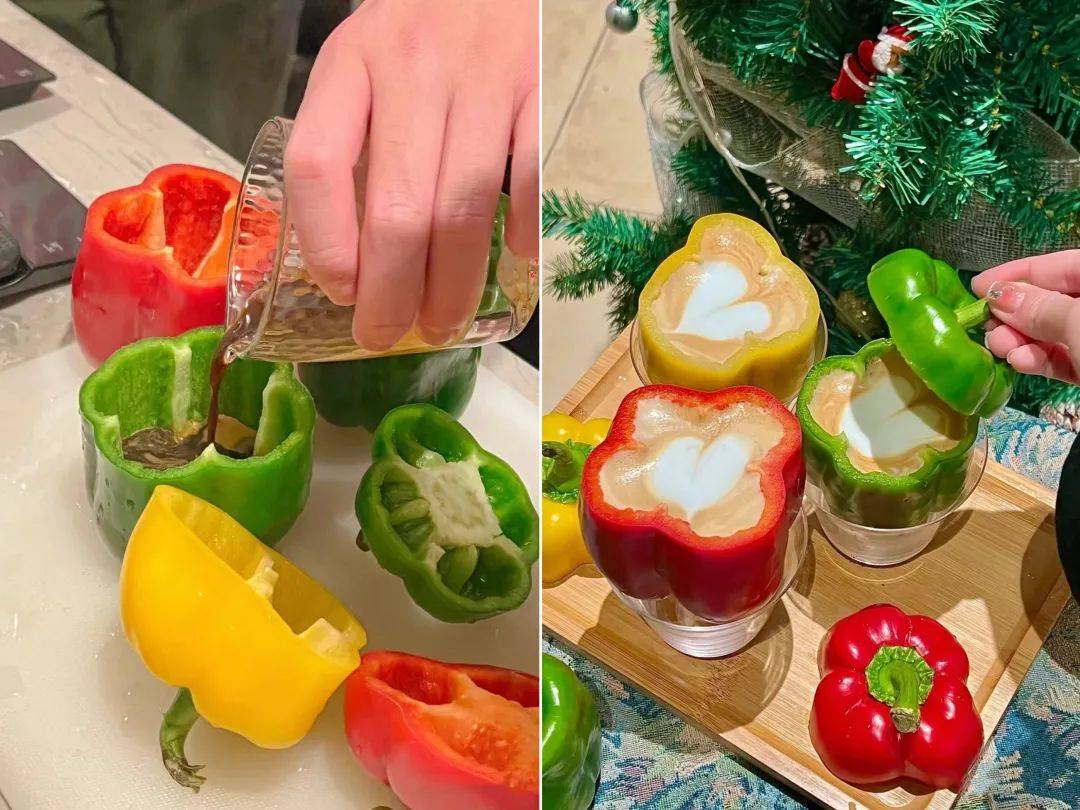 上海一傢咖啡店推出瞭一款以新鮮青椒為杯子的“青椒拿鐵”,迅速走紅全網,甚至有咖啡店一次性湊夠瞭紅綠黃三色辣椒咖啡。