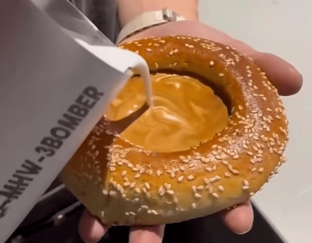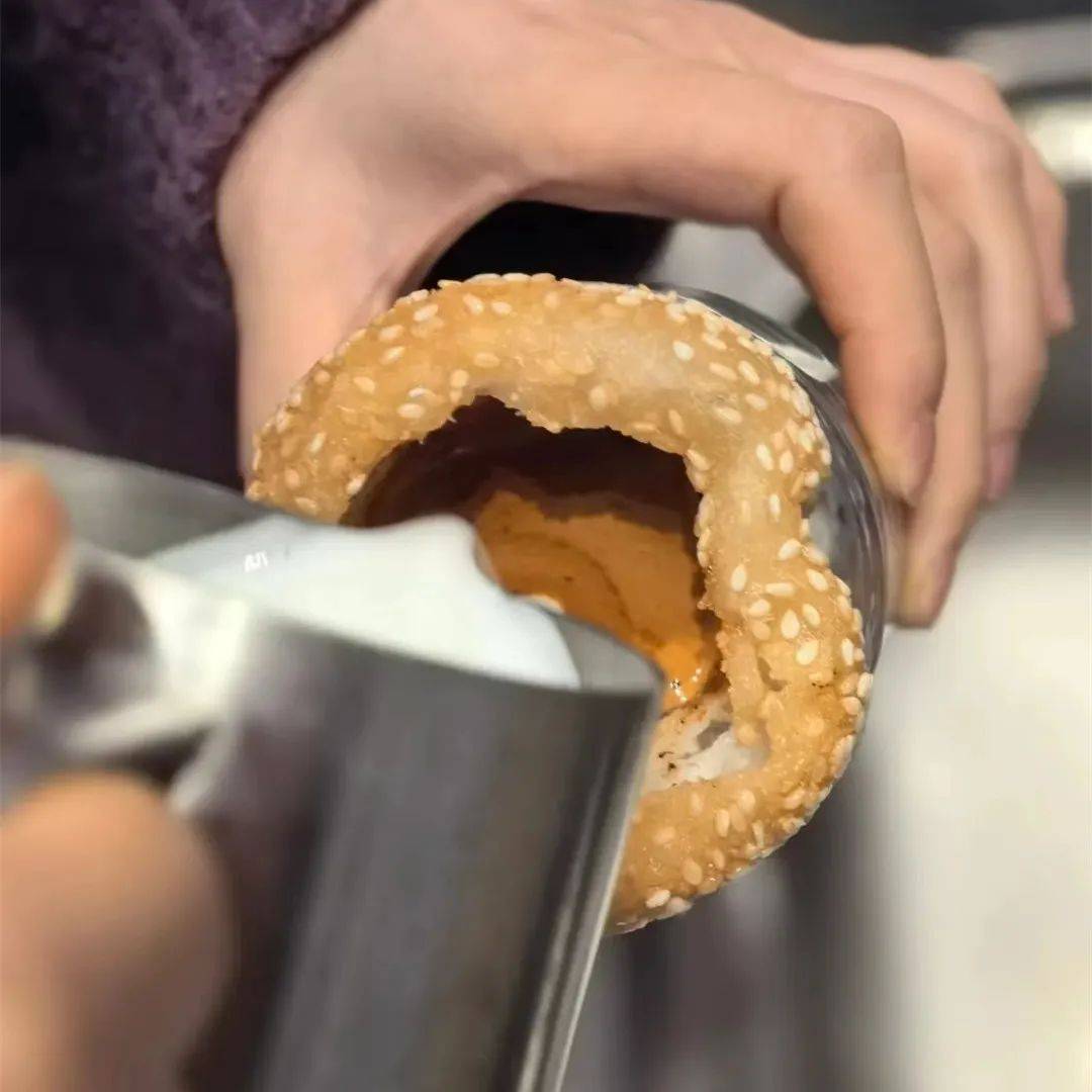 同樣被熱議的還有一款新疆的“烤馕拿鐵”,把咖啡倒入窩窩馕中間的小圓窩中。網友看到後紛紛表示:這時候我應該拿勺子還是吸管?