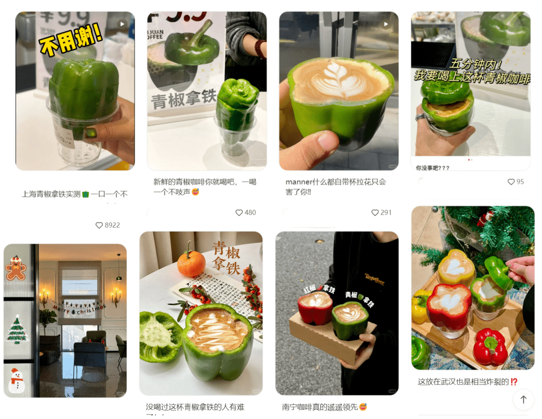 我發現,在“青椒拿鐵”火熱出圈後,各類“用食物做杯子”的咖啡陸續出現。