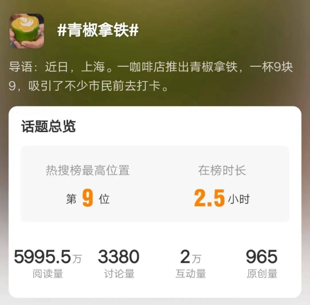 小紅書上,關於“青椒拿鐵”的分享筆記超過1萬篇;抖音上,相同話題播放量也突破4000萬;甚至,“青椒拿鐵”一度沖上微博熱搜,話題閱讀量近6000萬。