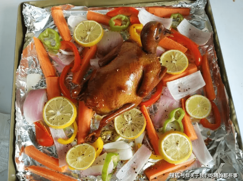 2、洋蔥剝洗幹凈後切塊,胡蘿卜洗幹凈切片,甜椒、尖椒切塊,檸檬切片,烤盤上鋪上錫紙,放上切好的各種配菜,再放上醃好的鴿子,肚子裡塞一個切掉兩頭的檸檬。