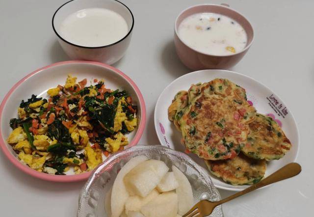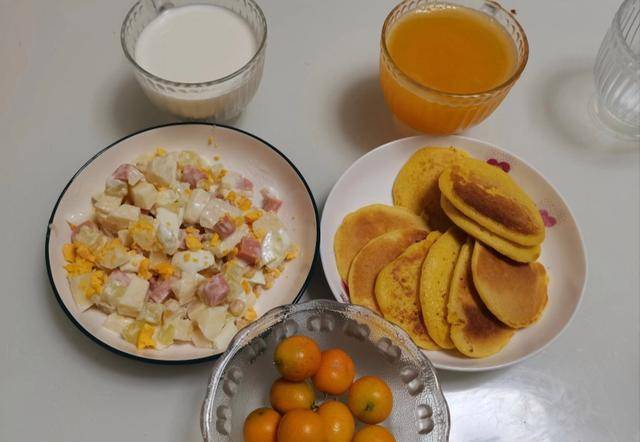 因為周末的時候有時間,夥食開得好,所以周一一般會吃清淡一點。自己烙的玉米餅,比國外那些松餅好吃太多,玉米的香味足,不油膩很入味,甜糯糯的口感讓人愛不釋手。蘋果雞蛋等食材做一個美味的沙拉,開胃不油膩,還能補充蛋白質和維生素。一杯牛奶一杯榨橙汁,也是補充營養的。這樣的早餐清淡而不油膩,能讓孩子恢復元氣。
