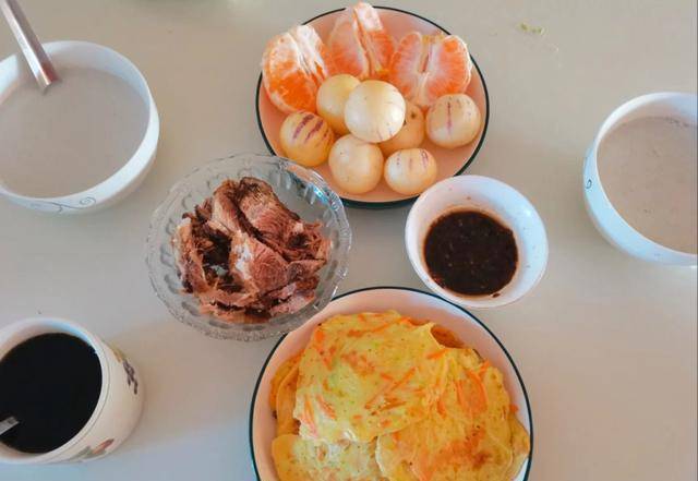 昨天的雞蛋餅很受歡迎,今天就做瞭胡蘿卜嫩南瓜餅,方法差不多,但是更嫩滑,而且蔬菜的甜味也更多。還給孫女搭配瞭一個蘸碟,可以蘸著餅或者鹵牛肉一起吃,味道更豐富。黑豆漿解膩開胃,搭配一碗龜苓膏清熱解毒,這樣的早餐也真的太豐富瞭吧。