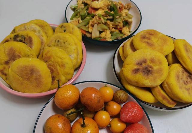 今天魏大姐做瞭好吃的餅,和這個是梅菜玉米餅,裡面塞著梅菜和五花肉,煸香之後特別入味,外皮暄軟,有韌性,雖然是餅,但是不油膩,香味十足。搭配一碟炒雞蛋,還有好吃的橘子草莓,一口一口吃得停不下來。
