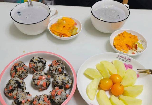 孫女點名要吃飯團,於是一大早魏大姐就蒸好米飯揉飯團,加瞭芝麻海苔火腿腸看著就知道好吃,做飯團加點白醋會更開胃。配菜是一個水果沙拉,還有一碗熱騰騰的芝麻糊,搭配爽口的水果。