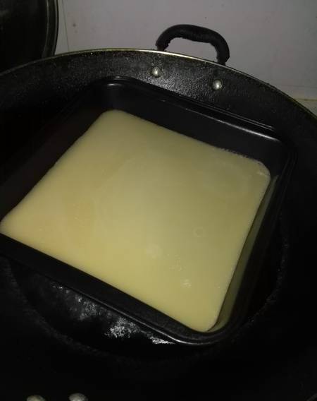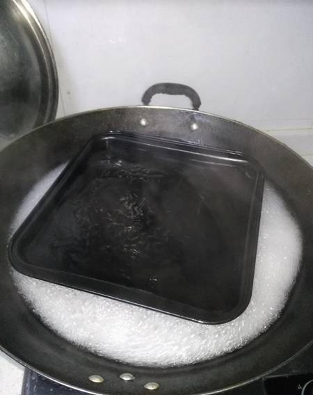 6、蒸鍋內加入足夠的水,碗底刷少許油,倒入一層黑芝麻糊小火煮5分鐘,再倒入一層白芝麻糊小火煮5分鐘。