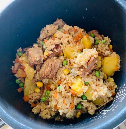 出鍋:煮好後,用勺子將米飯和排骨攪拌均勻即可享用。