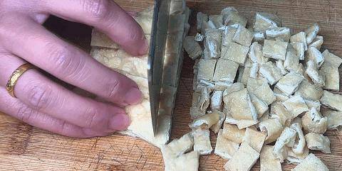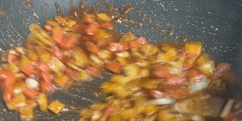 3、炸過的豆幹切成丁,火腿腸切成丁,