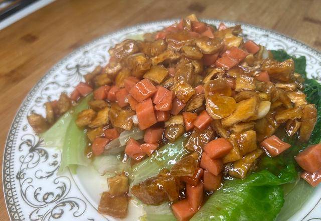 5、將豆幹和火腿腸炒至湯汁濃稠,淋在生菜表