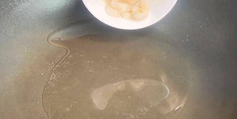 14.另起鍋加入植物油,下入蒜片爆香,倒入豆幹和火腿腸丁