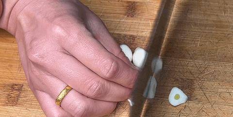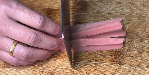 6.將兩根火腿腸剝去腸衣,縱向切成四瓣
