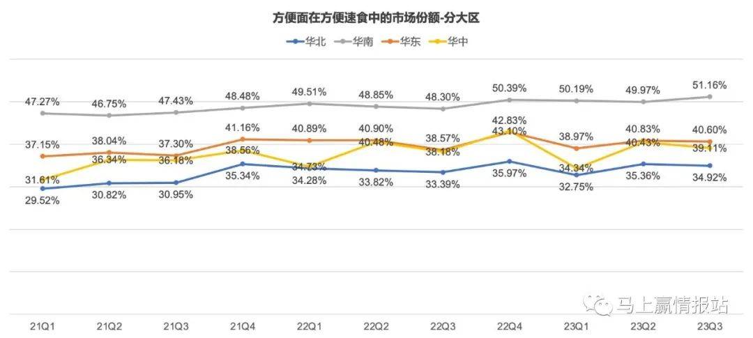 進一步來看,在華北、華南、華東、華中四個大區中,方便面在方便速食類目中的重要性也在持續提升。其中,方便面在華南方便速食類目中所占的市場份額最高,在2023年Q3甚至達到瞭51.16%,遙遙領先其他大區中方便面的市場份額占比。此外,華中地區方便面市場份額的波動雖大,但其中也並非毫無規律可言。不難發現,盡管方便面在華中方便速食市場中所占份額在每年Q1時往往會下降至谷底,但緊接著在Q2又會出現份額的快速提升。總之,在四個大區中,方便面在方便速食類目內的地位均較為穩固,平均約40%的市場份額數據也令其餘方便速食細分品類可望而不可及。
