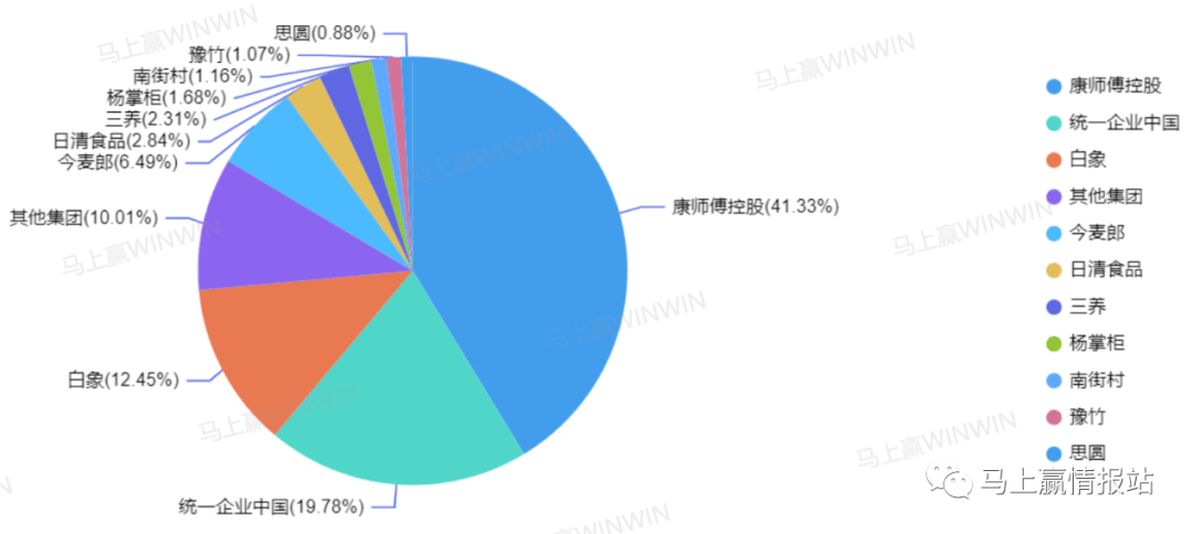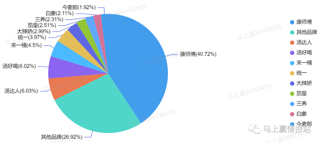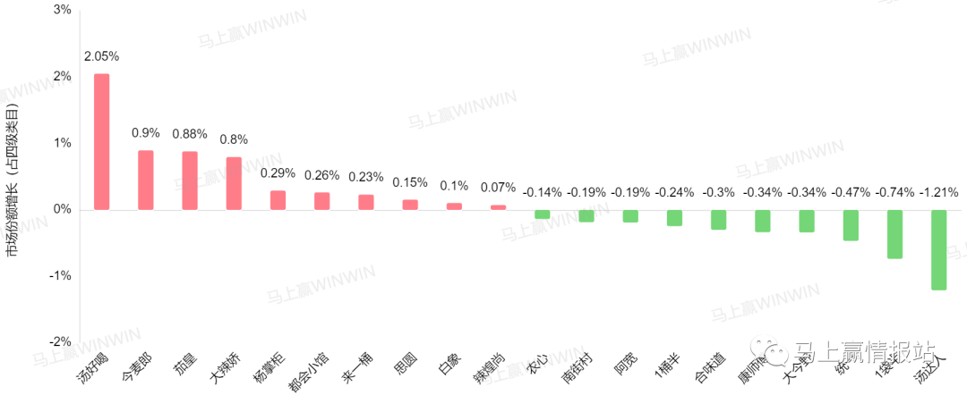 在品牌層面,康師傅、統一、今麥郎、白象等集團之間的競爭也十分激烈。就市場份額而言,康師傅、統一旗下品牌湯達人、白象旗下品牌湯好喝分別位居第一、二、三名。從品牌得失的角度看,白象旗下品牌湯好喝的市場份額在排名第三的同時保持瞭大幅提升,與集團同名的今麥郎品牌方便面產品排在得失增長的第二名,後續三、四名所屬的品牌也分別歸屬於統一、白象。