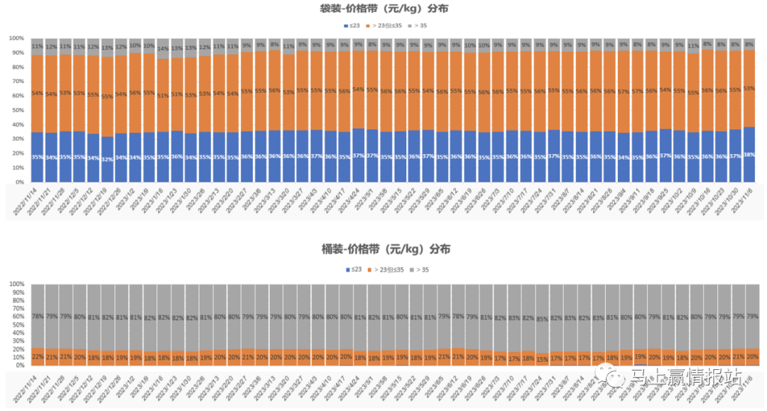 而在整體銷量較高的袋裝方便面內部,高端價位段市場也沒能躲過中低端價位段產品的擠壓。數據上看,盡管袋裝產品整體價位在方便面市場內偏低,以中低端價位為主,但高端價位段產品也仍舊難以維持其在2022年12%左右的市場份額。2023年以來,高端價位段的袋裝方便面本就不大的市場份額如今更是僅存8%。而在總體價格普遍較高的桶裝方便面內部,高端價位段產品也僅僅隻是做到瞭市場份額的保持,沒能從中端價位段產品手中搶奪更大的陣地。