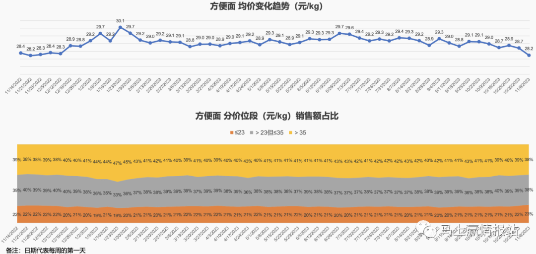 作為供需關系最直觀的體現,價格的變動往往能夠反映出一個市場最真實的發展狀況。而對於方便面而言,其均價在經歷瞭2022年方便速食高端標簽爭奪戰時的顯著提升後,在2023年又逐漸回落,甚至呈現出下降趨勢。這一趨勢在方便面分價位段(元/kg)銷售額占比數據上也有所體現,尤其是中低端價位段產品的市場份額從2023年開始的市場表現力相較於高端價位段產品更加強勢,將高端價位段產品的市場份額擠占至40%左右。
