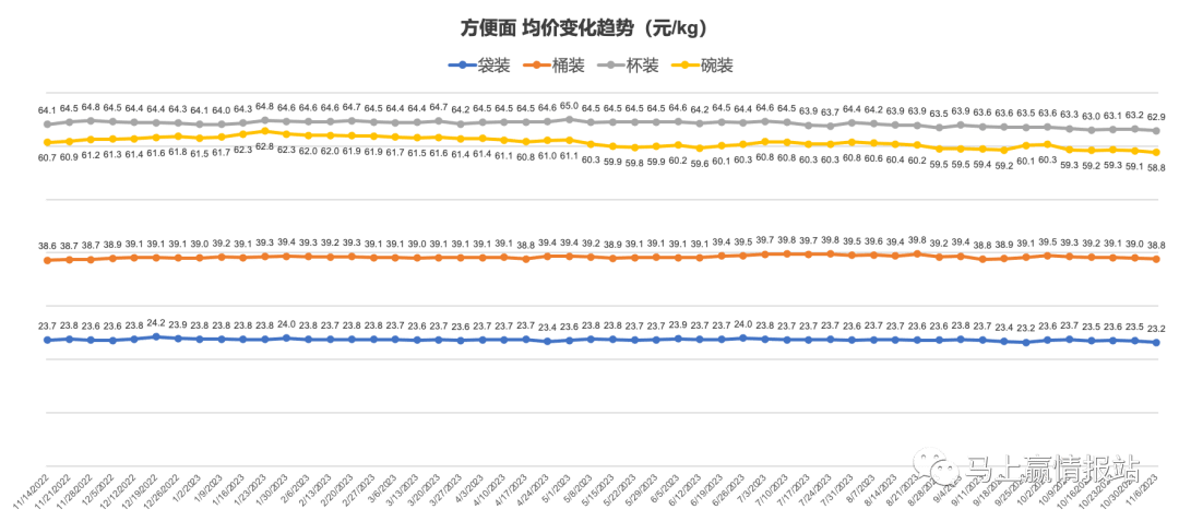 談到價格,可以發現對於方便面這類講究快捷方便的產品而言,包裝方式往往與其售價強相關。馬上贏在對方便面市場價格進行調研時,也關註到瞭這一方面。從包裝方式上看,包裝更為精致、均價相對較高的杯裝、碗裝方便面近期均價有所下跌,盡管幅度較小,但這在均價波動向來不大的方便面市場內也十分值得關註。